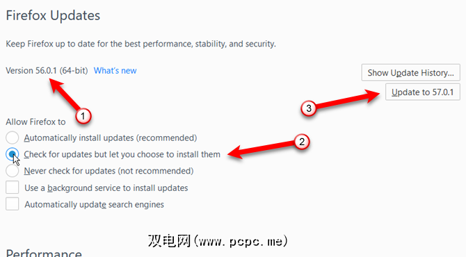 要阻止Firefox自动更新,请选择检查更新,但让您选择安装更新或永远不要检查更新,尽管不建议使用更新。