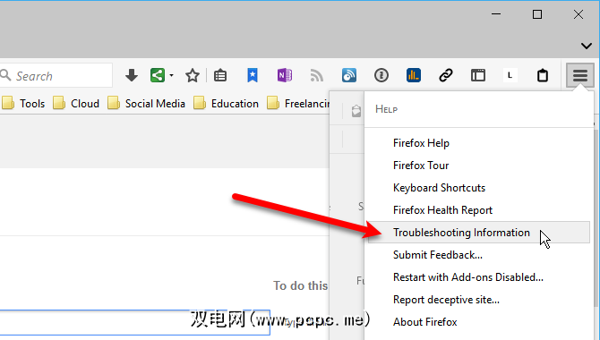 单击Firefox菜单按钮,然后单击帮助选项。然后,单击帮助菜单上的故障排除信息。