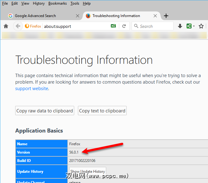 另一种查找正在运行的Firefox版本的方法是在“疑难解答信息"页面上。