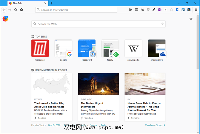 默认情况下,新建标签页面设置为Firefox中的主页。 “新标签" 页面显示指向您最常访问的热门网站的缩略图链接。您还将看到Pocket推荐的站点,Pocket现在是Mozilla的一部分,并包含在Firefox中。 “新标签" 页面的底部列出了您最近访问过或加了书签的网站的要点。还有自定义“新标签页"页面的方法。
