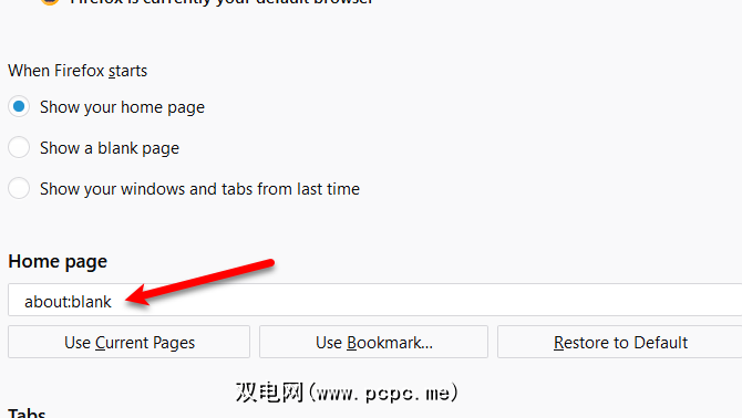 如果您的主页上不需要任何内容,可以将其设置为空白页。为此,请点击Firefox菜单,然后选择选项。在首页框中输入关于:空白,然后关闭选项标签。