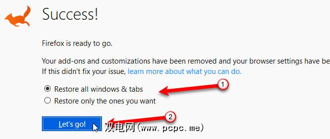 Firefox重新打开,并在选项卡上显示成功屏幕,询问您是否要还原所有窗口和选项卡,还是仅还原所需的窗口和选项卡。选择一个选项,然后单击开始。