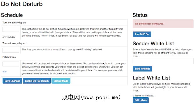 DNDEmail会阻止Gmail在设置的时间段内向您显示新电子邮件。例如,您可以让Gmail每小时显示一次电子邮件,而不是在收到电子邮件后立即显示。这是收件箱中的“请勿打扰"标志。当然,您可以将重要人物列入白名单,例如老板,这样您就可以立即看到他们的消息。