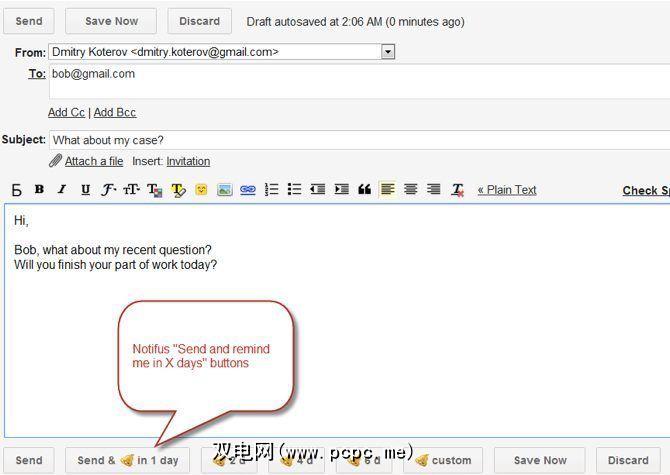 Notifus是一个免费的附件,可发送有关未收到回复的重要电子邮件的提醒。不用单击“发送"按钮,而是单击其中一个按钮“在X天内发送并提醒我"。就这么简单,并且可以使用。