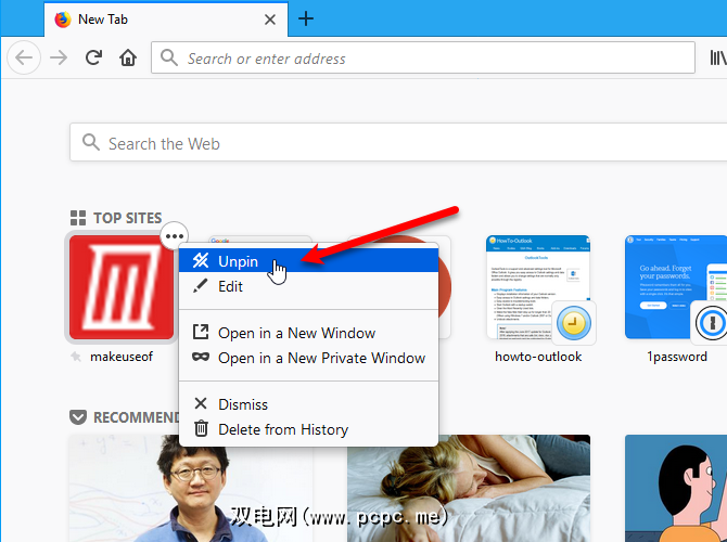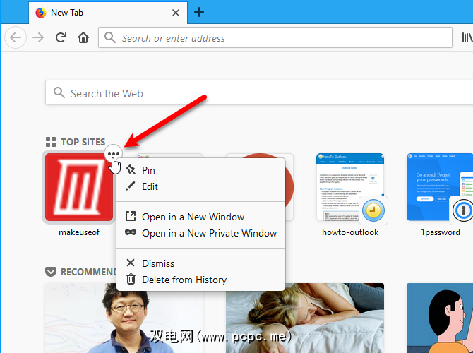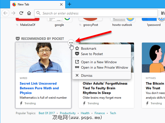 就像在热门网站部分,由口袋推荐部分中的每个图块都有一个菜单,可让您对该图块执行操作。要访问图块菜单,请将鼠标移至选项卡的右上角,直到看到带有三个水平点的圆圈。单击圆圈以打开菜单。