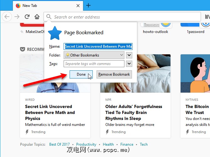 短暂显示一个弹出窗口,可让您更改书签的名称,将其放入特定的文件夹,然后添加标签。标签使您可以轻松地搜索书签。