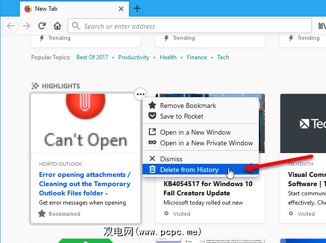 突出显示部分中的图块菜单。选择从历史记录中删除,以从浏览历史记录中删除该网站。这与热门站点磁贴上的从历史记录删除选项相同。