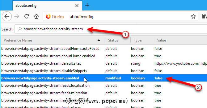 开始在搜索框中输入 browser.newtabpage.activity-stream.enabled 。当您在列表中看到该设置时,请双击它以将其值更改为 false 。