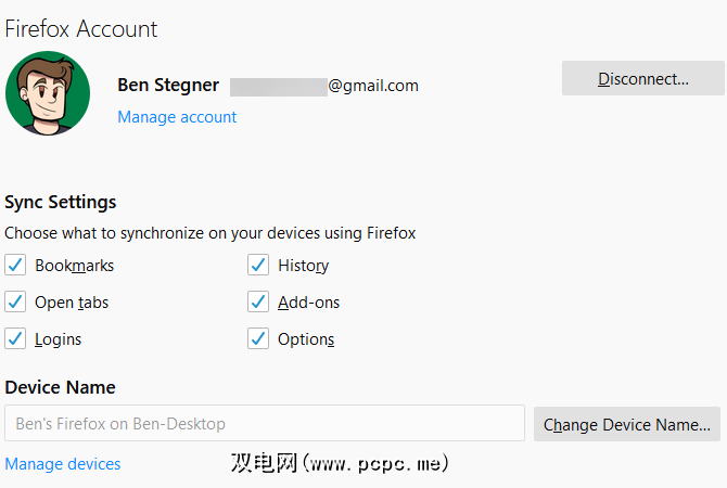 现在,您已经拥有一个Firefox帐户,最好确保以您喜欢的方式进行设置。在选项的 Firefox帐户选项卡上,单击您姓名下的管理帐户文字。