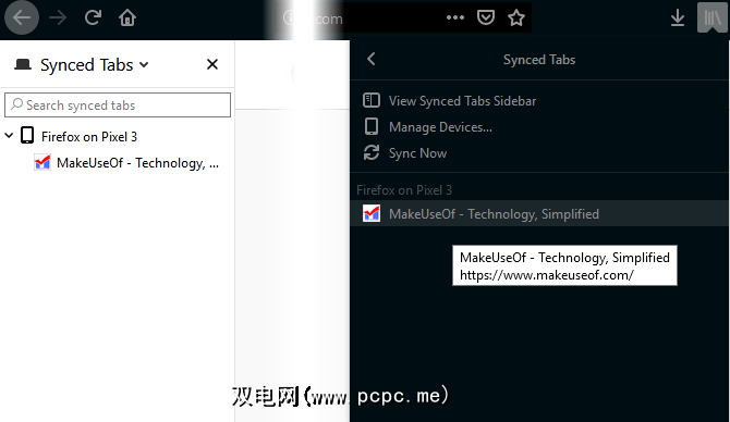 此处,展开已同步标签页条目,您将看到每个其他设备的标签。如果您经常使用此功能,则可以启用“查看同步的选项卡"边栏选项。这样一来,您就可以轻松访问浏览器左侧的已同步标签。