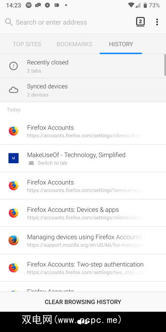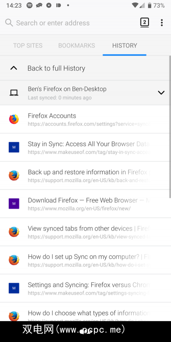 要从移动设备上的其他设备访问标签,请打开新的Firefox标签,然后滚动到历史记录标题。点击已同步的设备,您会看到来自其他已同步的计算机和电话的打开的选项卡列表。