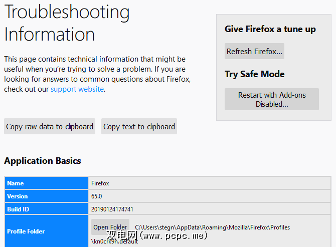 通过单击Firefox右上方的三栏式 Menu 按钮并选择帮助>故障排除信息。这将打开一个包含各种技术信息的新标签;您对个人资料文件夹字段感兴趣。点击打开文件夹按钮,“文件资源管理器"窗口将打开您的文件夹配置文件。