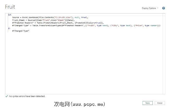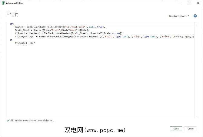 letSource = Excel.Workbook(File.Contents("C:\Fruit.xlsx"), null, true),Fruit_Sheet = Source{[Item="Fruit",Kind="Sheet"]}[Data],#"Promoted Headers" = Table.PromoteHeaders(Fruit_Sheet, [PromoteAllScalars=true]),#"Changed Type" = Table.TransformColumnTypes(#"Promoted Headers",{{"Fruit", type text}, {"City", type text}, {"Price", type number}})in#"Changed Type"代码以 let 语句开头,该代码开始每个代码块。 Power Query要做的第一件事是将文件导入到名为 Source 的变量中,该变量只是我们选择导入的 Fruit.xlsx 文件。