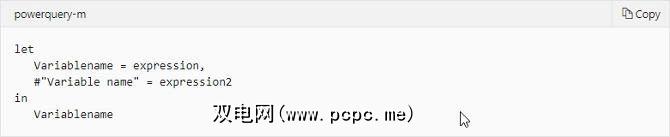 在Power Query脚本中, let 是放置您要运行的代码的位置(输入),并且输入是您要运行它的位置(输出)。在 let 语句中运行的代码可以由变量,表达式和值组成。