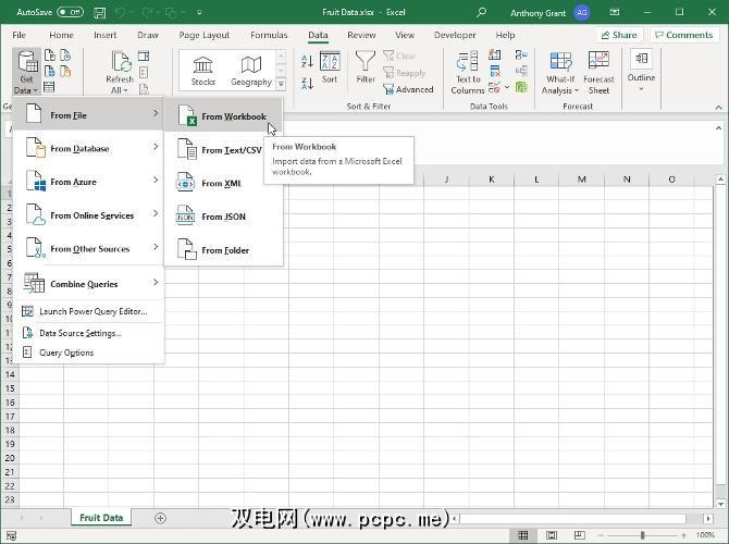在工具栏中选择 Data ,然后单击获取数据。这将为您提供选择数据源的选项,我们希望它来自文件>来自工作簿。