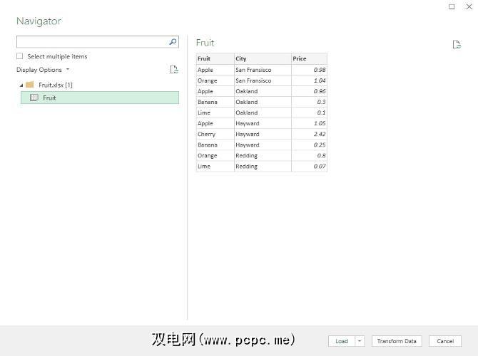 一次单击确定,将弹出Power Query Navigator,以在工作簿中选择数据。从工作簿中选择水果表,您选择的数据的预览将显示在右侧,以确认您的选择。