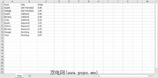 在此示例中,让我们创建一个名为 Fruits.xlsx 的表格,该表格显示各种水果及其价格。对于“水果" ,“城市" 和“价格" 。