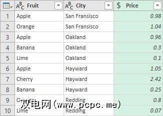 #"Changed Type" = Table.TransformColumnTypes(#"Promoted Headers",{{"Fruit", type text}, {"City", type text}, {"Price", type number}})我们有更改整个表的数据类型的代码!在这里我们可以进行调整并获得结果。