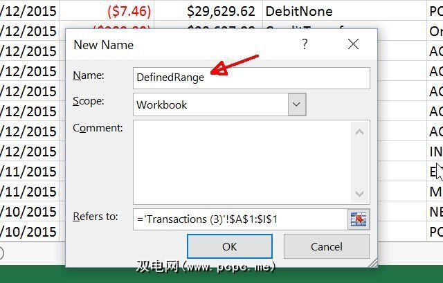 您会发现“工作簿"是选中的范围,并且工作表名称和范围已填充到引用到字段中。只需在名称:字段中输入您要记住的范围的名称即可。