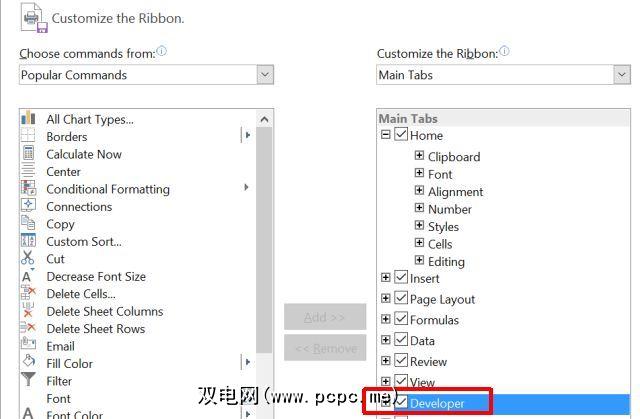 在下一步中,您需要单击“开发人员"菜单项,然后从开发人员菜单中选择查看代码。如果您在菜单中没有看到开发者选项,则需要通过转到文件>选项>自定义功能区来启用它。确保在此处选择 Developer 。