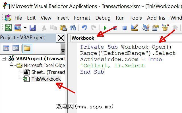 单击菜单中的 View Code 后,请确保双击 ThisWorkbook 对象,然后在右窗格中,从右下拉菜单的方法列表中选择 Open 。