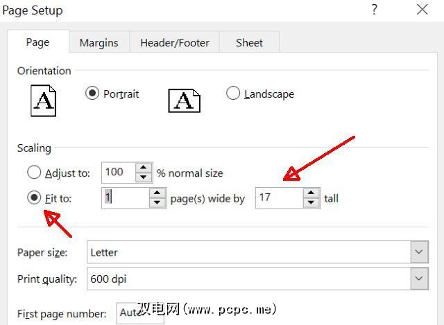 相反,选择 Fit to:(适合于:),然后更改 tall 设置为一个高得离谱的数字,该数字比电子表格中实际需要打印的纸张数量高得多。