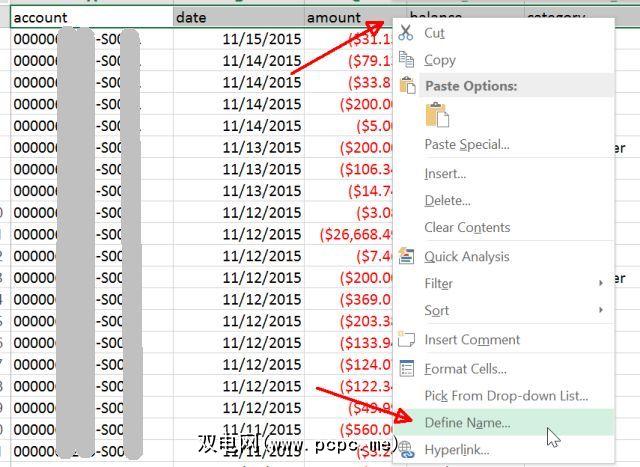 右键单击突出显示的行中的任意位置,然后选择 Define Name…