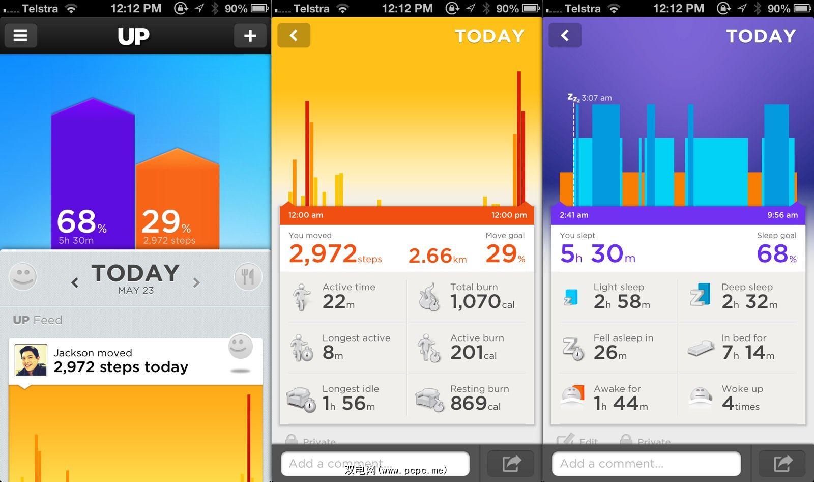 Jawbone UP的移动应用程序可以弥补在线仪表板的不足,因此设计精美且非常有见地。它以一种易于消化的方式进行分析,然后对数据进行布局:每日进度,采取的步数和行进距离,活动时间,闲置时间和消耗的卡路里。由于UP还跟踪您的睡眠方式,并且如果您记得在睡觉前启用睡眠模式,那么您将获得一些有关夜间活动的非常有趣的报告:浅睡眠时间与深睡眠时间,次数您醒了,睡了多久了。就我个人而言,我的睡眠水平很差-借助Jawbone UP和Fitbit Flex的报告,我现在意识到我每晚从睡眠中醒来4至14次。它有助于获得有关我的睡眠质量的可量化数据,因为我可以尝试其他技术来改善自己的睡眠并确定可行的方法。