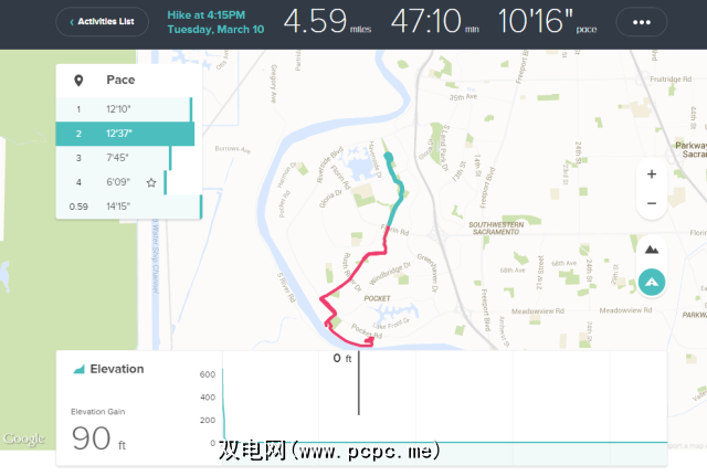 如前所述,户外运动预设采用GPS跟踪。位置数据会发送到FitBit的服务器,在客户端,用户可以查看其慢跑或远足路线的地图。