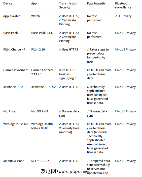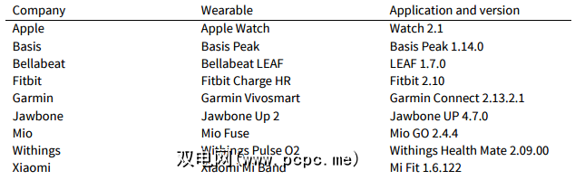 加拿大非营利研究组织开放效应和跨学科研究实验室 Citizen Lab 检查了当前可用的八种最受欢迎的健身可穿戴设备:Apple Watch,Basis Peak,Fitbit Charge HR,Garmin Vivosmart,Jawbone UP 2,Mio Fuse,Withings Pulse O2 ,以及小米Mi Band。