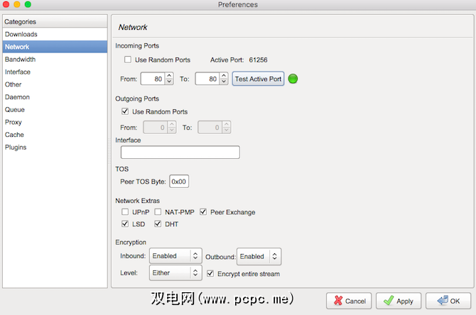 转到该应用程序的网络偏好设置,然后首先取消选中“随机端口"。然后将端口80设置为端口,并进行测试以确保其正常工作。最后,取消选中UPnP和NAT-PMP复选框,一切就好了。