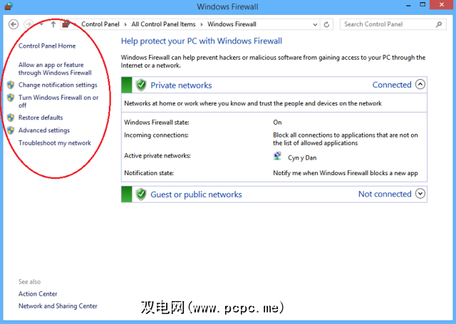 要更改设置,请打开控制面板,然后点击 Windows防火墙。到那里后,您可以在左侧菜单中找到几个选项来进行调整,禁用和加固防火墙。不必担心使用设置,如果您输入有误,可以随时单击恢复默认设置,将所有设置恢复为购买/升级机器时的状态。