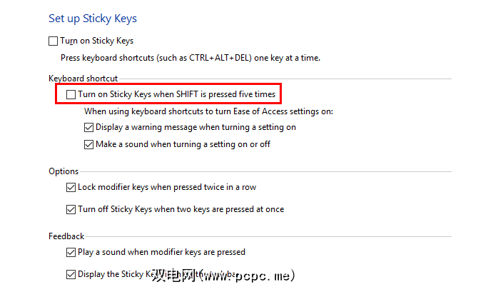 要关闭此功能,请按五次 Shift ,以显示“粘滞键"对话框。点击进入轻松访问中心... 以跳至“粘滞键"设置,然后取消选中在按住Shift键五次后打开粘滞键。这样可以防止对话框弹出。