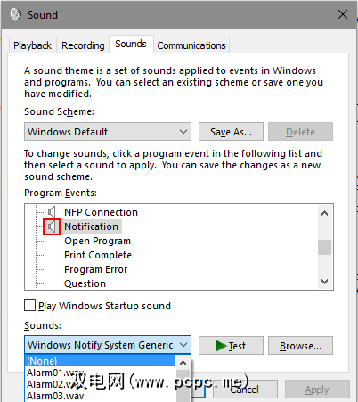 如果要微调个人相反,请滚动浏览下面的列表。当前启用的任何声音旁边都会带有扬声器图标。从下面的声音下拉框中选择 [无] 使其静音。确保还取消选中播放Windows启动声音,这样当您潜入会议深夜时就不会开始播放音乐了。