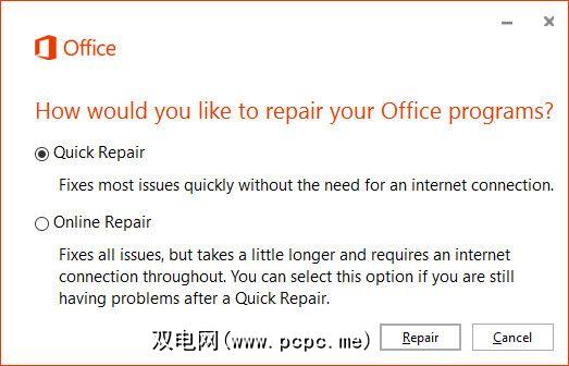 您应该看到允许您修复安装的选项,具体取决于在您使用的Office版本上,它们可能与下图略有不同。