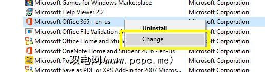 要整体修复Office,请转至控制面板的程序和功能部分。找到正在使用的Microsoft Office版本,右键单击它,然后选择更改。