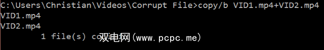 copy/b VID1.mp4+VID2.mp4此命令将两个文件缝合在一起,而不是第一个文件。您需要稍等片刻,但最后VID1.mp4和VID2.mp4将合并到VID1.mp4中。如果现在的时间是原来的两倍,就可以使用修复工具,如上面所示。