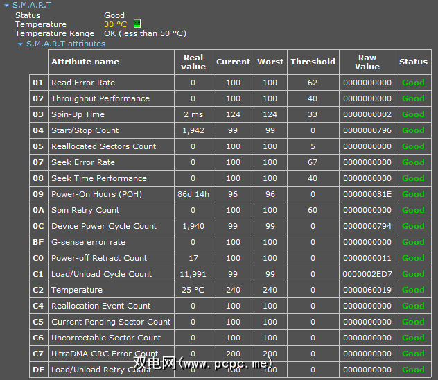 SMART代表自我监控,分析和报告技术。内置硬盘监视系统报告各种硬盘健康状况属性。如您所见,Speccy为每个监视指标指定了一个等级。我们对以下指标特别感兴趣: