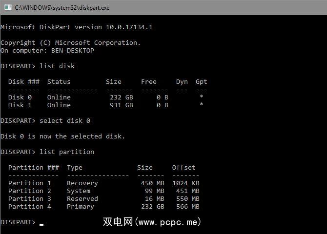 select disk Xlist partition第二个命令将显示全部内部驱动器上的分区。您的主分区可能是 0 ;对我来说是 4 (标记为主要)。