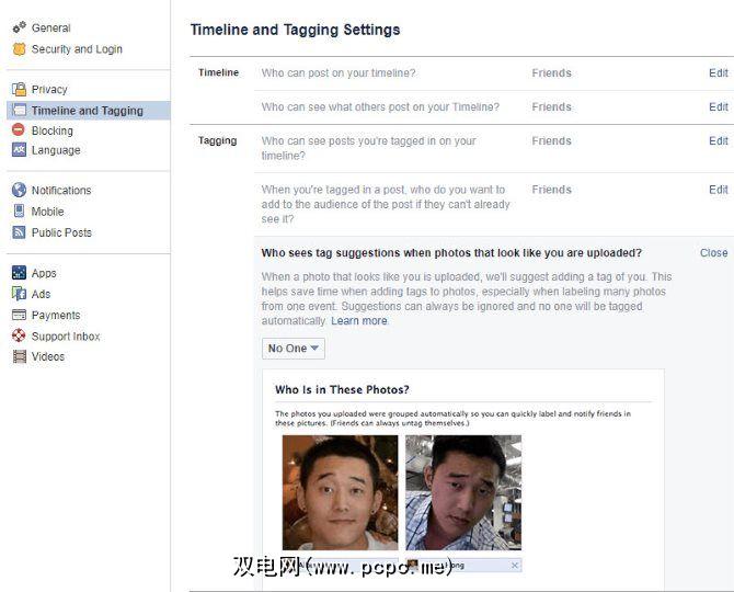 您不能在Facebook上屏蔽照片标签,但可以禁用建议。再次访问设置,然后从左侧边栏中选择时间轴和标签。在上传看起来像您的照片时谁会看到标签建议?选项上,选择 No 。