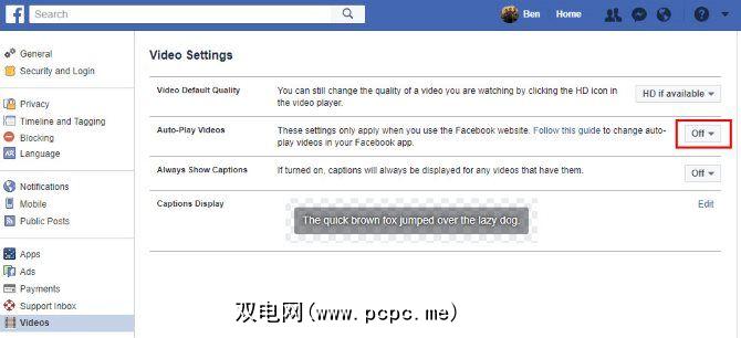 要关闭视频自动播放,请单击Facebook上任意位置的右上角箭头,然后选择设置 >。点击左侧的视频标签,然后将自动播放视频选项设置为关闭。