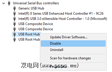 在设备管理器中,找到条目通用串行总线控制器,并禁用您可以找到的任何USB Root Hub条目。