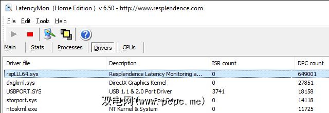 或者,您可以安装并运行LatencyMon(延迟监视器)以查找DPC计数最高的驱动程序文件。按下开始/播放按钮,然后切换到 Drivers 标签,并按 DPC计数对驱动程序文件进行排序。