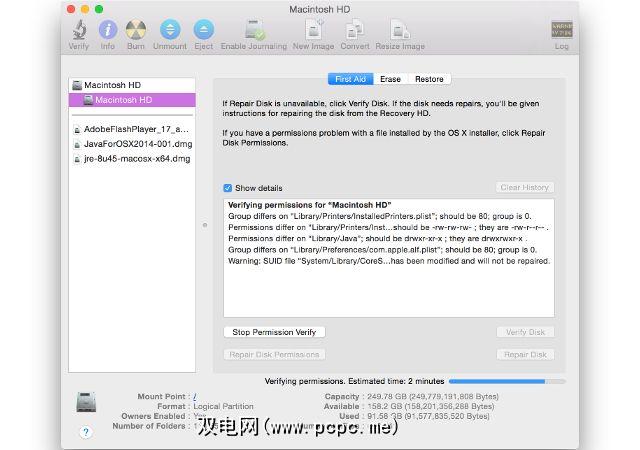 几乎可以肯定地看到了许多许可需要修复。验证停止运行后,点击修复磁盘权限按钮。如果需要修复很多权限,这可能需要一段时间,所以请喝杯咖啡。