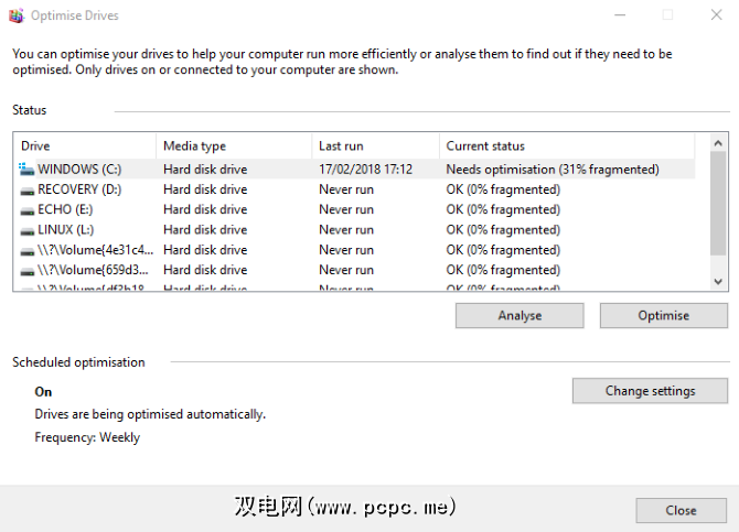列出了麻烦的驱动器,将其选中,然后选择分析。等待完成。 “当前状态"列将告诉您是否需要采取措施。如果是这样,请确保仍选择驱动器,单击优化,然后等待磁盘碎片整理。