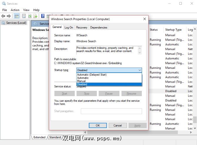 要禁用索引编制,请按 Windows + R 并输入 services.msc 。单击确定,然后等待“服务"窗口打开,然后向下滚动至 Windows搜索。右键单击并选择属性,然后选择停止。完成此过程可能需要一段时间,但一旦完成,请单击启动类型:下拉菜单,然后选择 Disabled 。