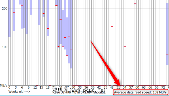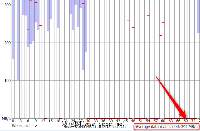 SSD Read Speed Tester生成的图表在两轴图表上显示磁盘读取速度。 X轴显示每个文件的年龄。 Y轴显示读取速度。如果您发现超过9周的文件数量异常,读取速度比正常速度慢,那么您将遭受该错误的困扰。如果在运行DiskFresh之后这些缓慢的速度仍然存在,则可能是程序运行不正确,或者磁盘问题是由其他原因引起的。