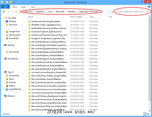 首先,您需要在视图菜单中启用隐藏的文件夹,然后转到Users / User / AppData / Local / Microsoft / Windows /应用程序快捷方式。