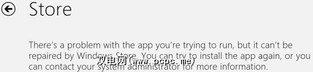 检查Windows商店以获取更多信息",以及指向该商店的链接。如果用户单击商店的链接,他们将再次收到错误消息,提示“您要运行的应用存在问题,但Windows Store无法修复。您可以尝试再次安装该应用程序,或者可以与系统管理员联系以获取更多详细信息。