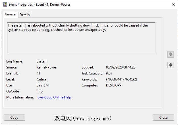 内核电源严重错误与事件ID 41相关联。此外,内核电源事件ID 41伴随有关键字( 70368744177664),(2),可用于查明错误的故障排除方法。